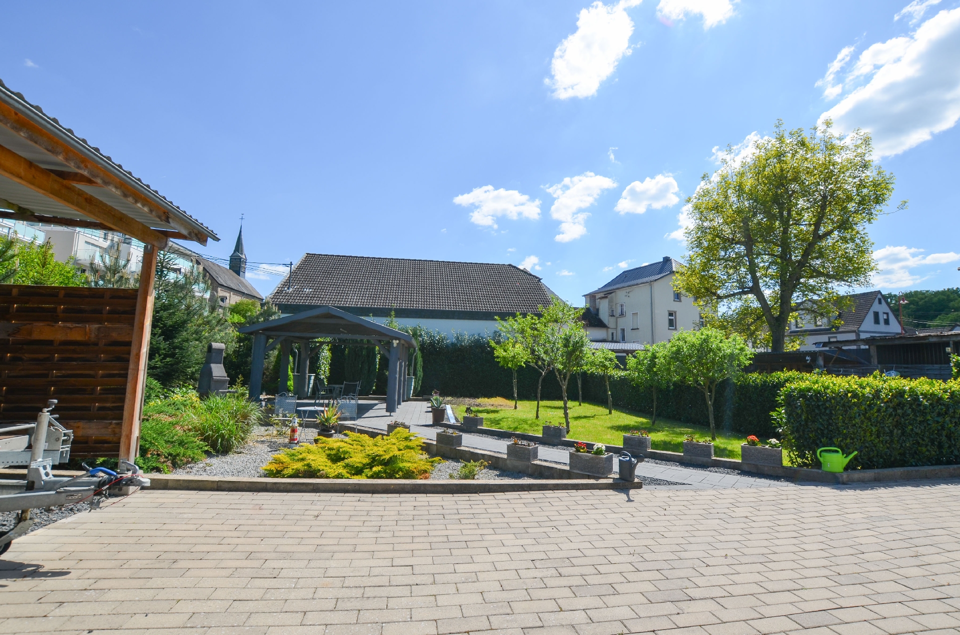 Im hinteren Bereich des Grundstücks erwarten Sie ein überdachter Freisitz, zwei Carports sowie zwei Garagen. Weitere Außenstellplätze sind ebenfalls vorhanden.