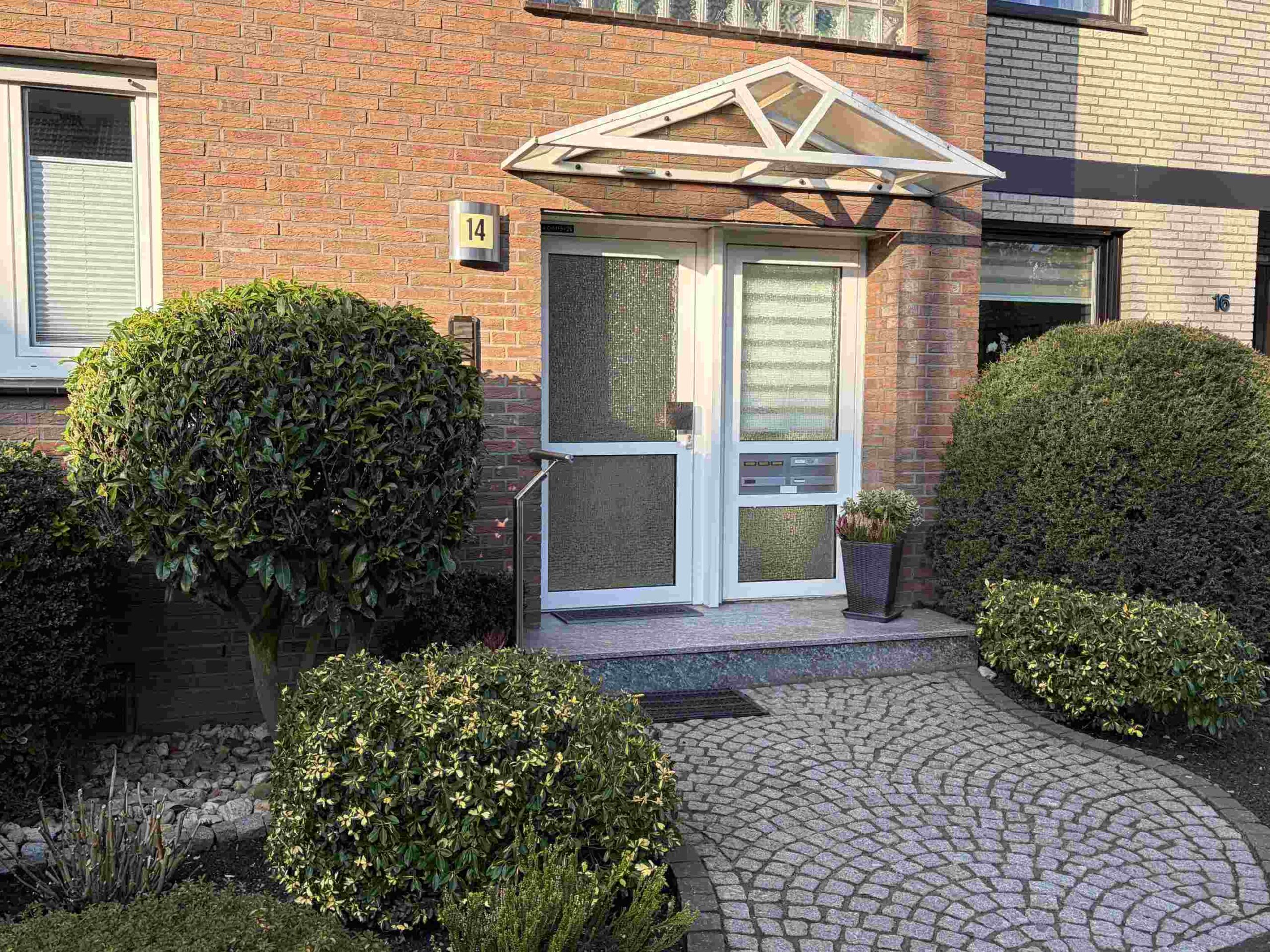 Zur Wohnung gehören eine geflieste Terrasse mit Markise, ein pflegeleichter Garten sowie eine direkt an das Grundstück angrenzende Garage.