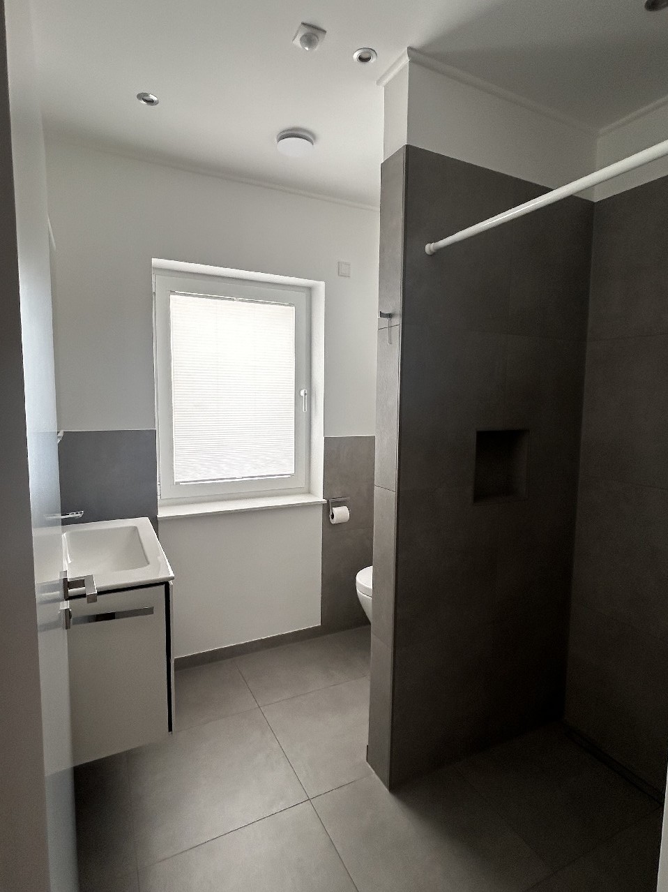 - Badausstattung: Dusche, Badewanne, Fenster im Badezimmer