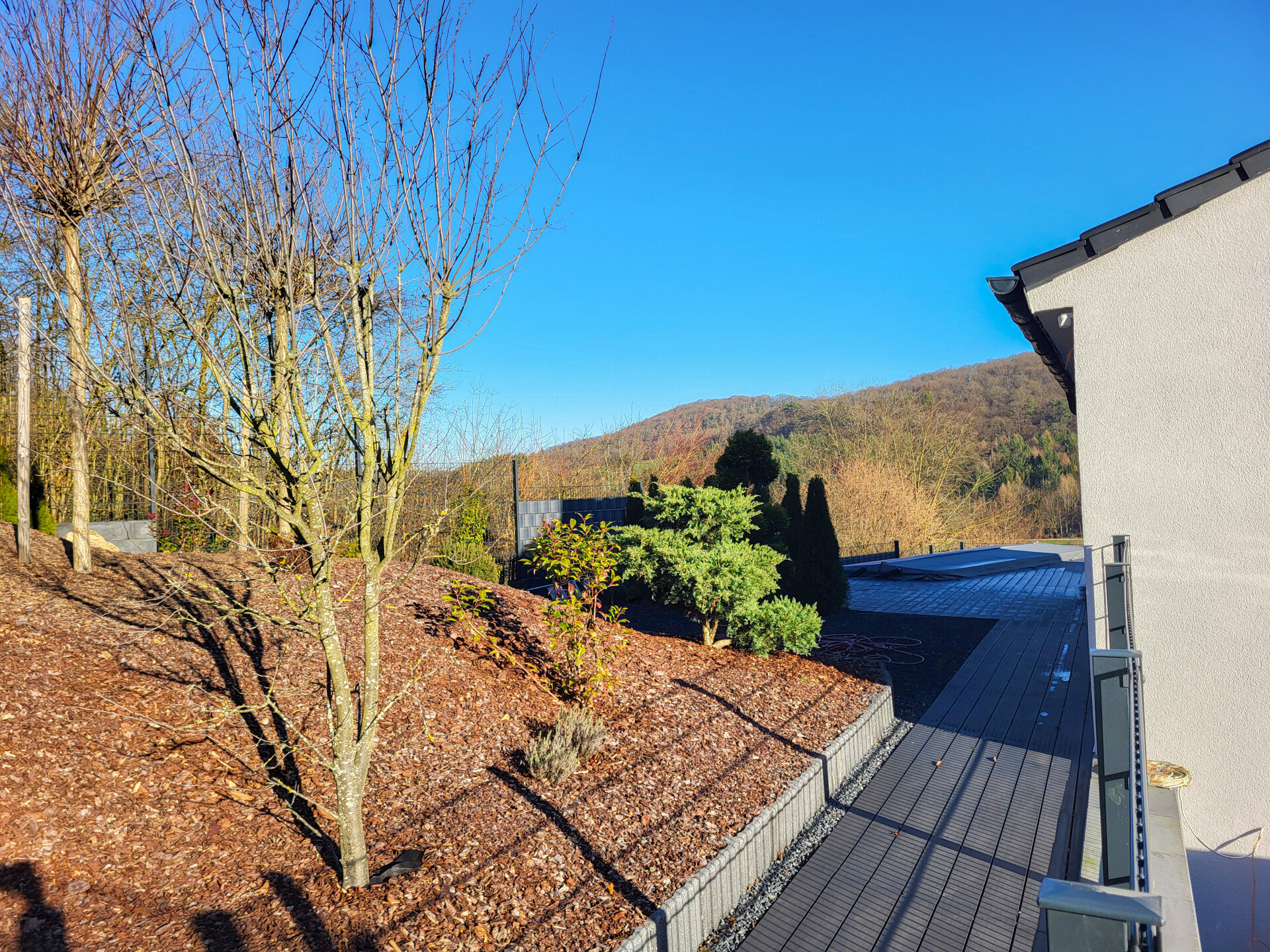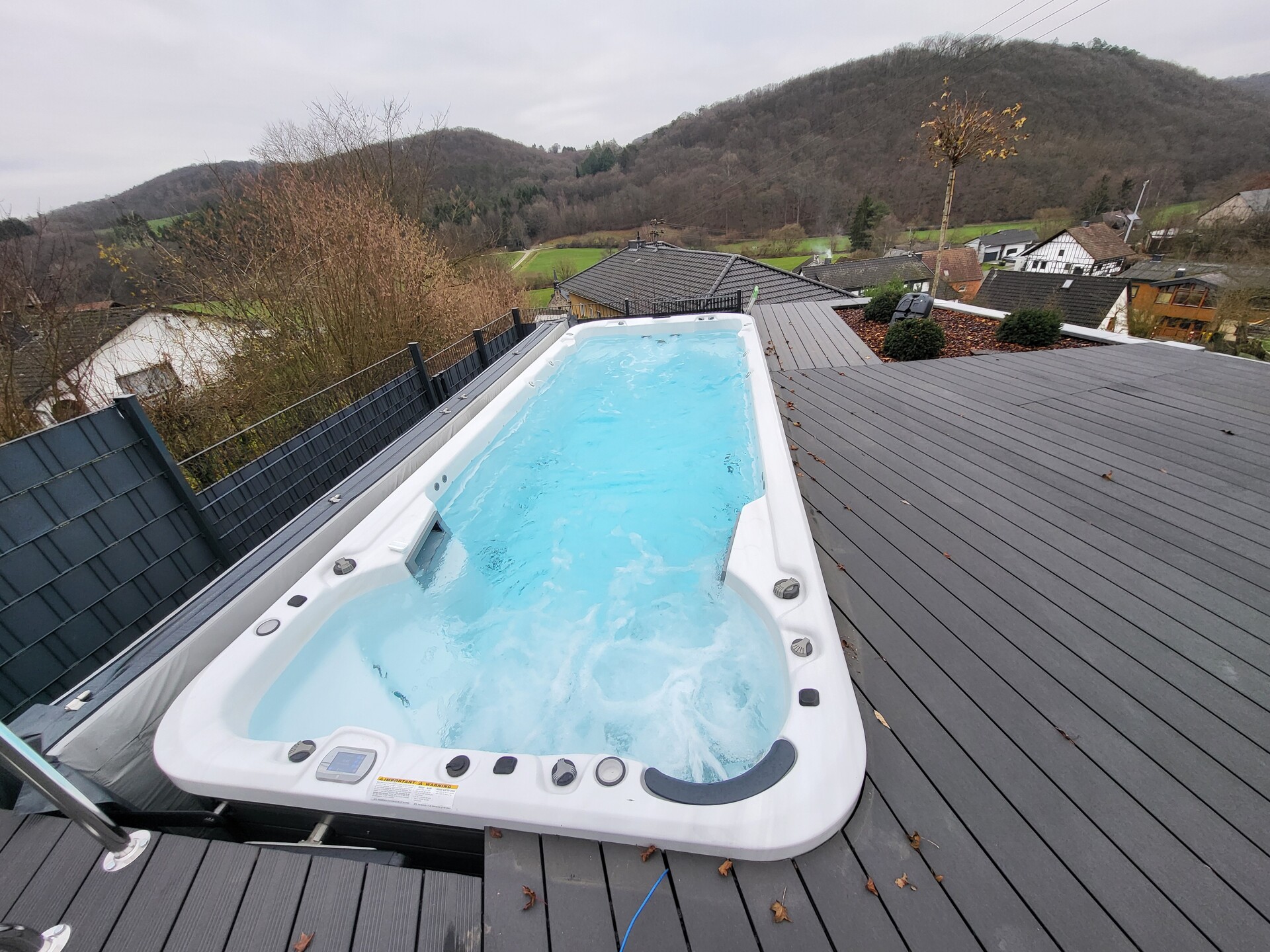 Im Essbereich bestehen ideale Voraussetzungen für einen Anbau. Darüber hinaus lässt sich im aktuellen Wohnbereich problemlos ein weiterer Schlafraum realisieren. Von der Terrasse aus genießen Sie einen faszinierenden Ausblick. Zudem befindet sich dort ein Swimspa mit Whirlpool und Gegenstromanlage, das für entspannte Stunden sorgt.