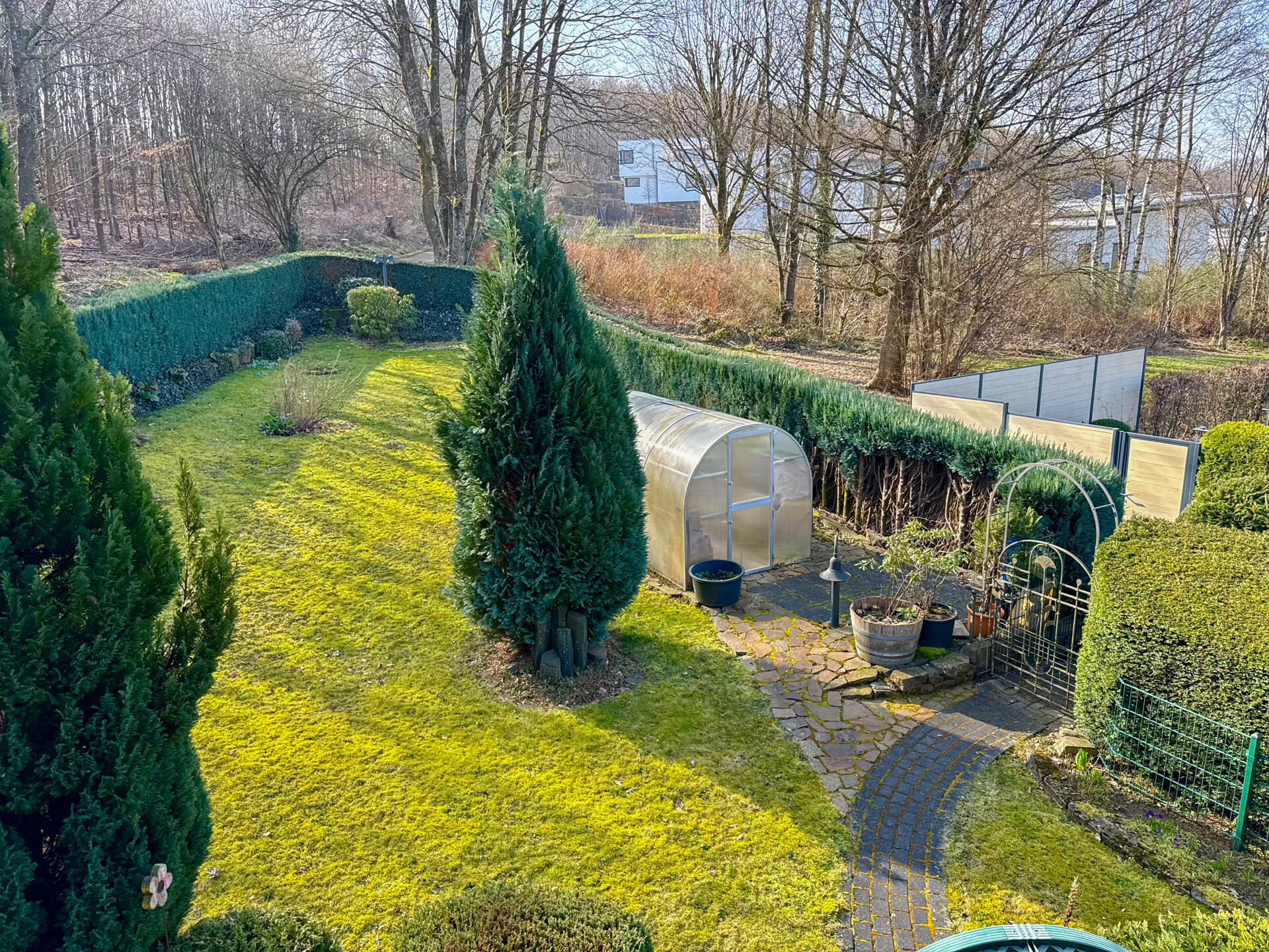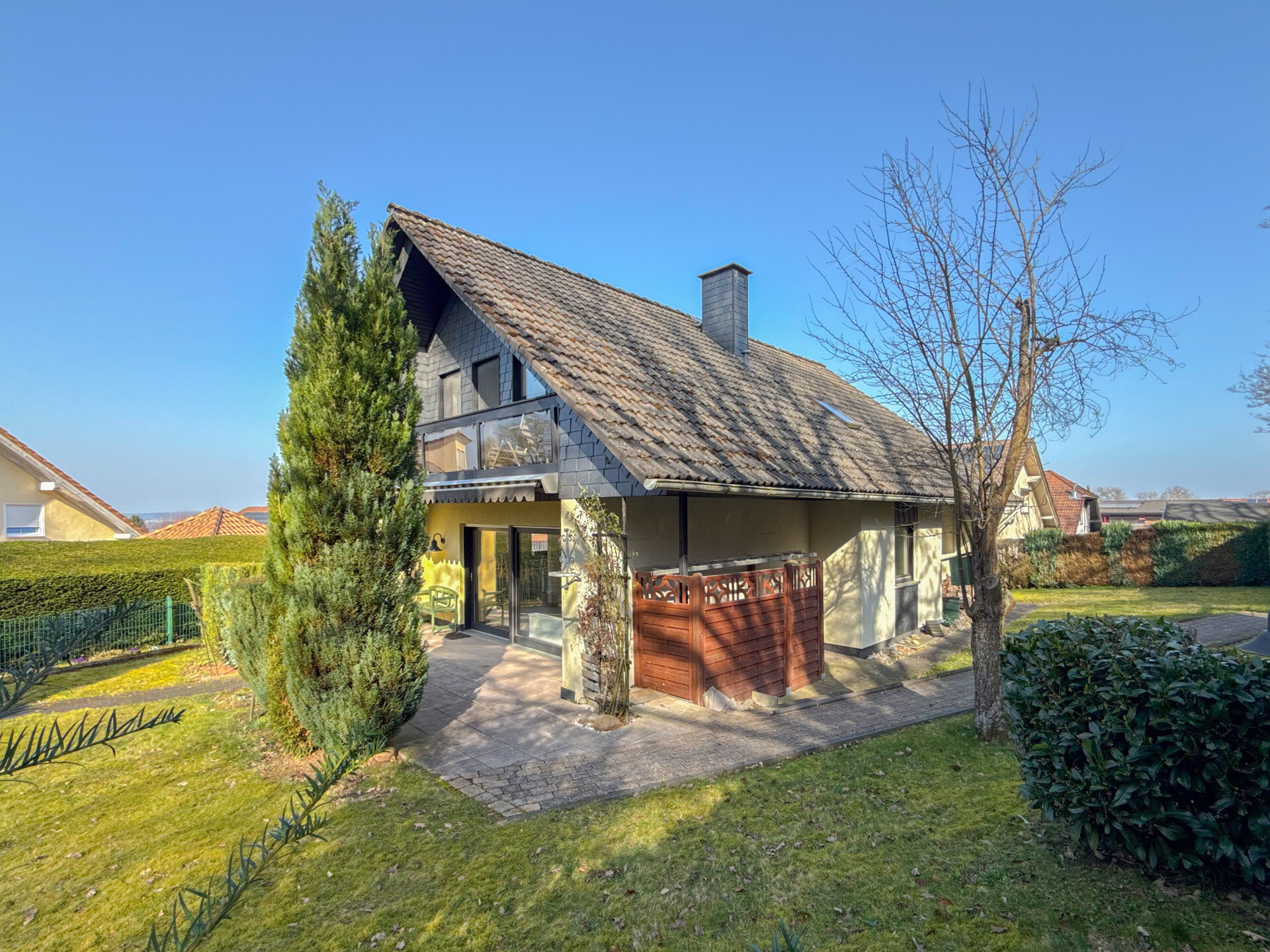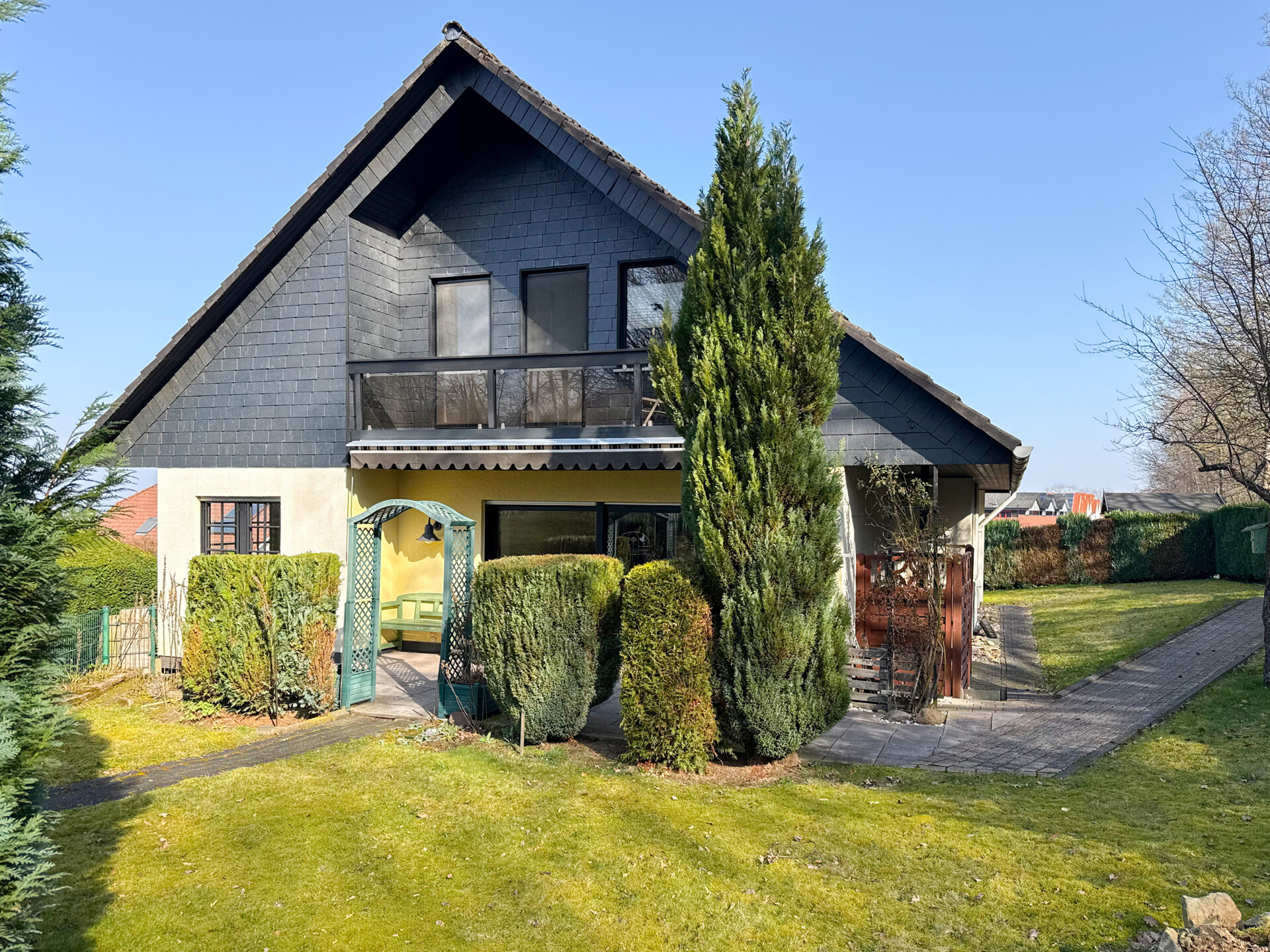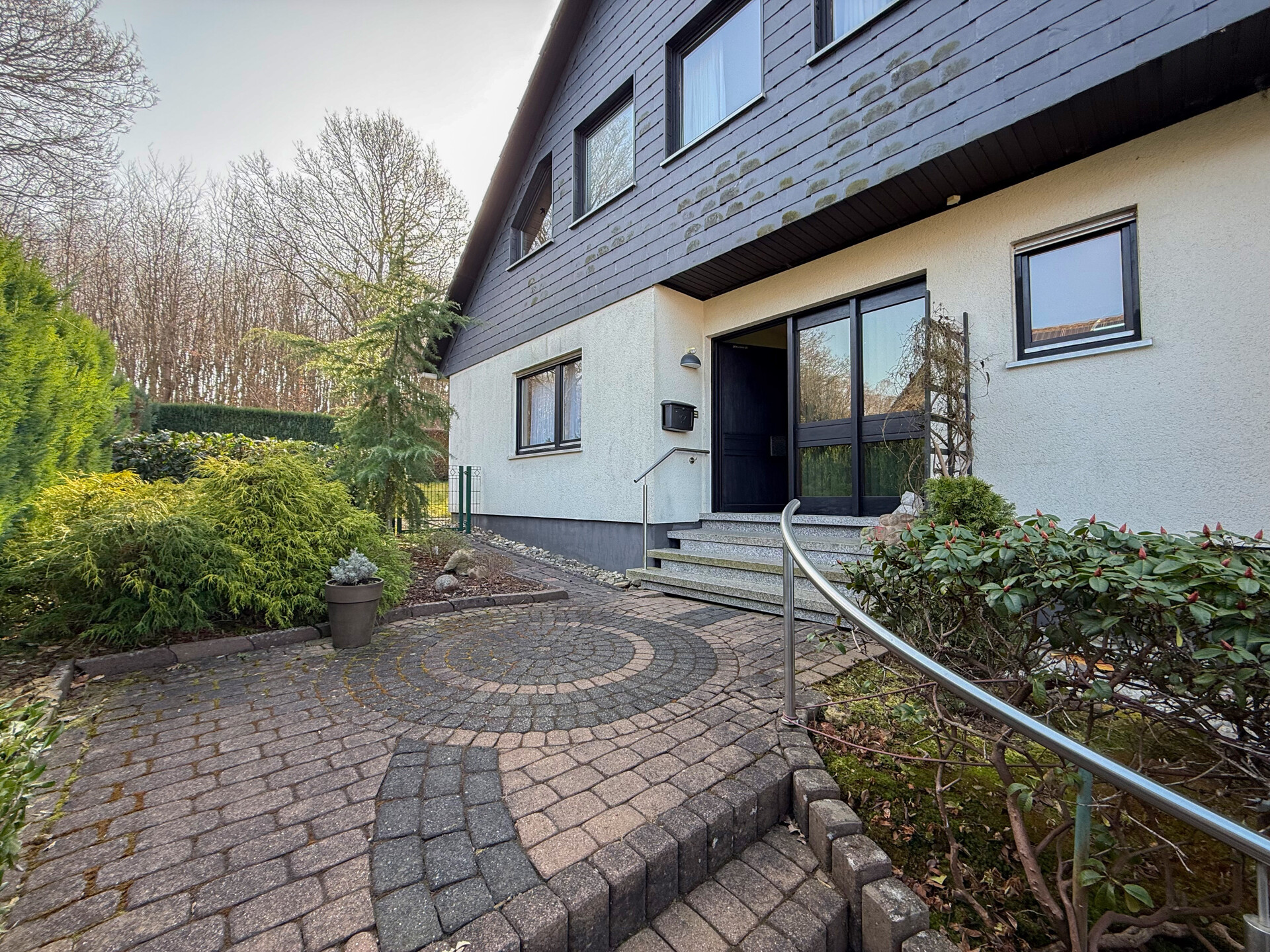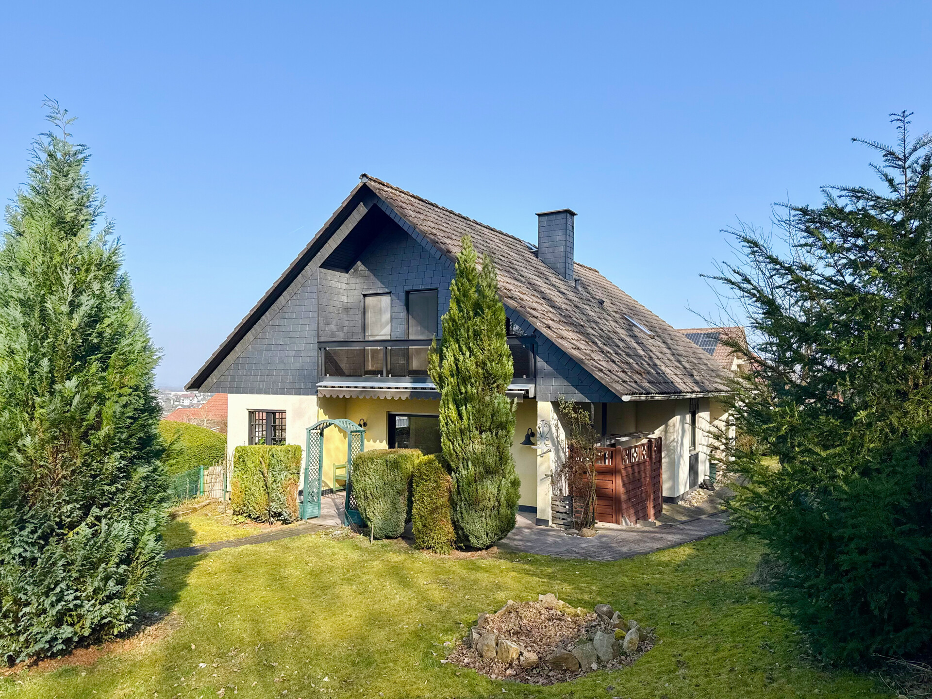 Dieses gepflegte Einfamilienhaus aus dem Jahr 1986 bietet mit rund 160 m² Wohnfläche auf einem ca. 868 m² großen Grundstück vielseitige Möglichkeiten. Es handelt sich um ein Fingerhut-Fertighaus mit durchdachter Aufteilung und der Option, das DG als Einliegerwohnung zu nutzen. Die Lage in einem verkehrsberuhigten Bereich ist besonders attraktiv für Familien. Direkt angrenzend an den Waldrand genießen Sie hier Ruhe und ein angenehmes Wohnumfeld. Das EG ist altersgerecht gestaltet und überzeugt durch eine schöne, offene Raumaufteilung. Küche und Essbereich gehen harmonisch ineinander über und öffnen sich zum Wohnzimmer mit Kachelofen. Eine große Fensterfront, zur Südterrasse ausgerichtet, sorgt für viel Tageslicht. Ergänzt wird diese Ebene durch ein Gäste-WC und ein Schlafzimmer mit Bad – ideal für komfortables Wohnen auch im Alter. Im DG stehen zwei Schlafzimmer, ein Bad sowie eine Wohnküche zur Verfügung. Dieser Bereich eignet sich hervorragend für größere Kinder, Gäste oder als separater Wohnraum. Vom Balkon aus haben Sie einen tollen Blick auf das Grundstück. Das Haus ist massiv, vollunterkellert und bietet reichlich Platz für Hobby oder Werkstatt. Ein Gewächshaus, eine Einzelgarage sowie 3–4 Stellplätze runden das Angebot ab.