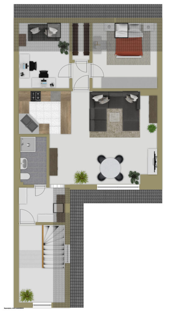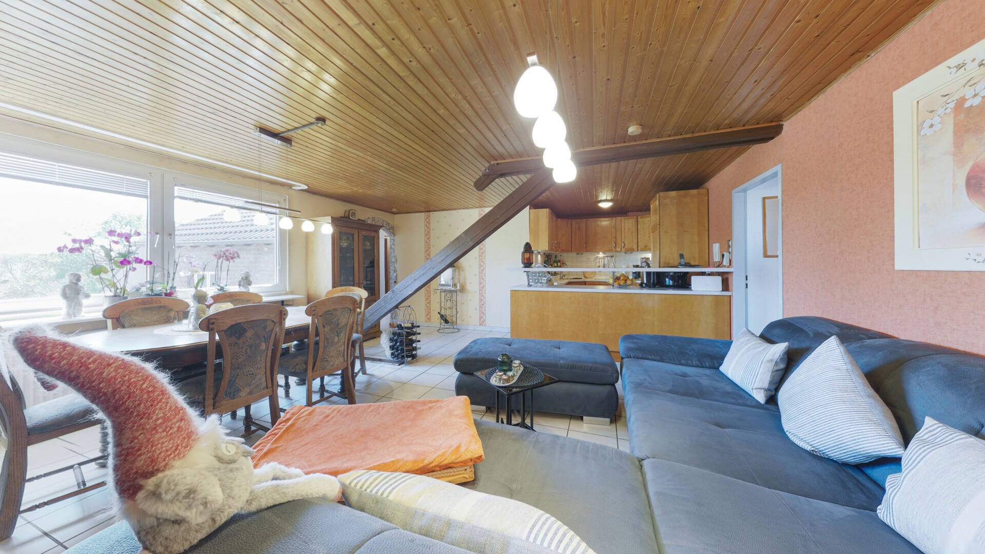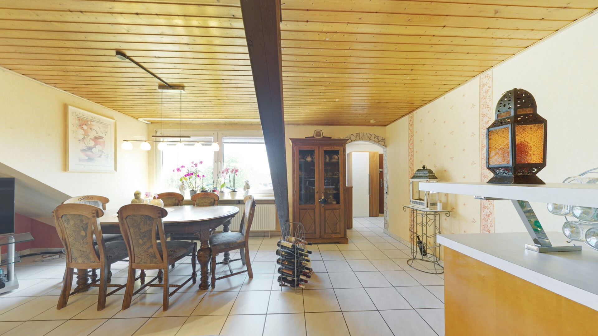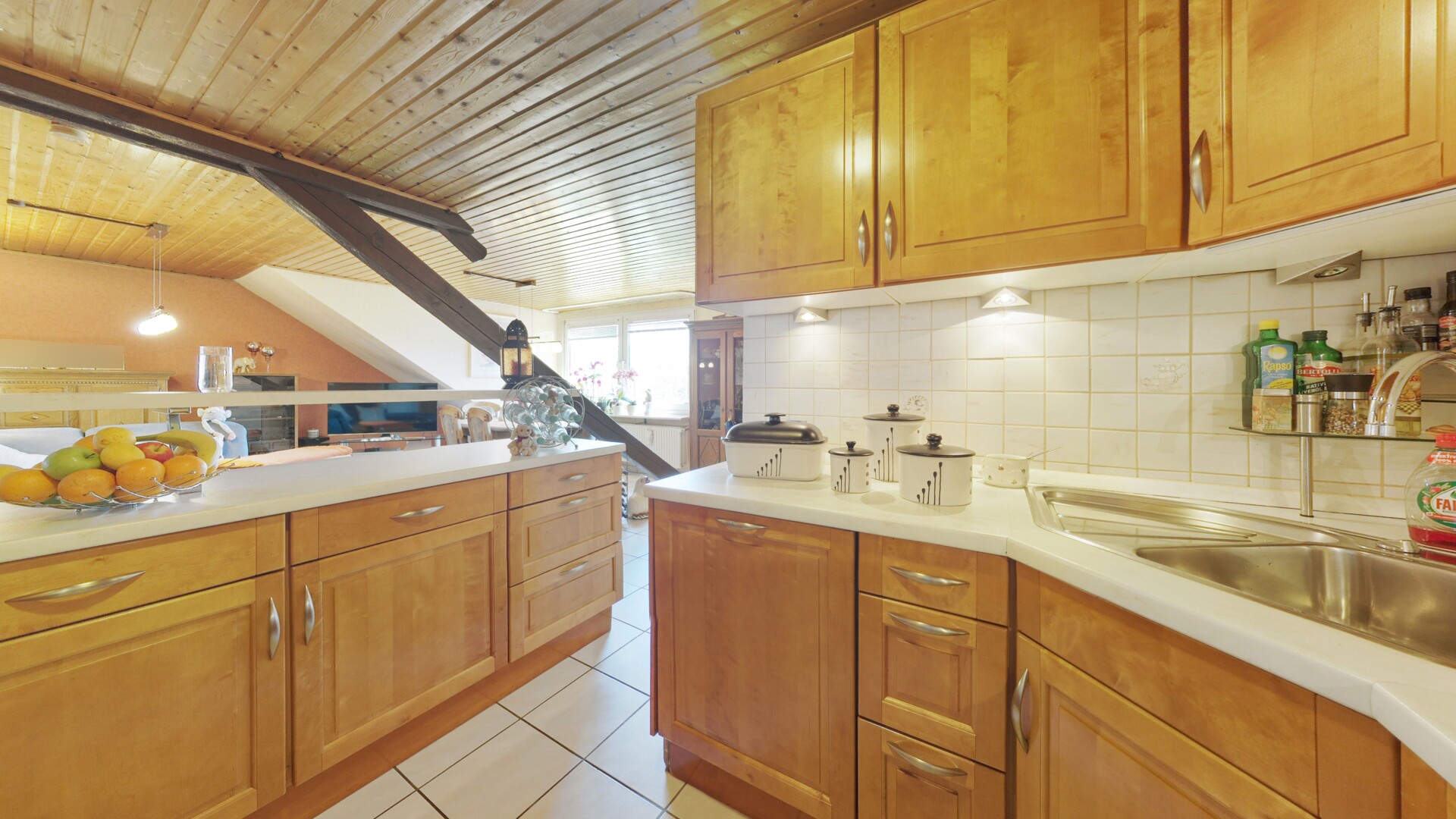 Das Herzstück dieser Immobilie ist zweifellos der großzügige Wohn- und Essbereich. Dank der großflächigen Fensterfronten wird der Raum in natürliches Licht getaucht, während die charmanten Dachschrägen und sichtbaren Holzelemente eine unvergleichliche Gemütlichkeit schaffen. Die angrenzende, offen gestaltete Küche mit ihren warmen Holzfronten fügt sich harmonisch in das Gesamtbild ein und lädt zu geselligen Kochabenden ein.