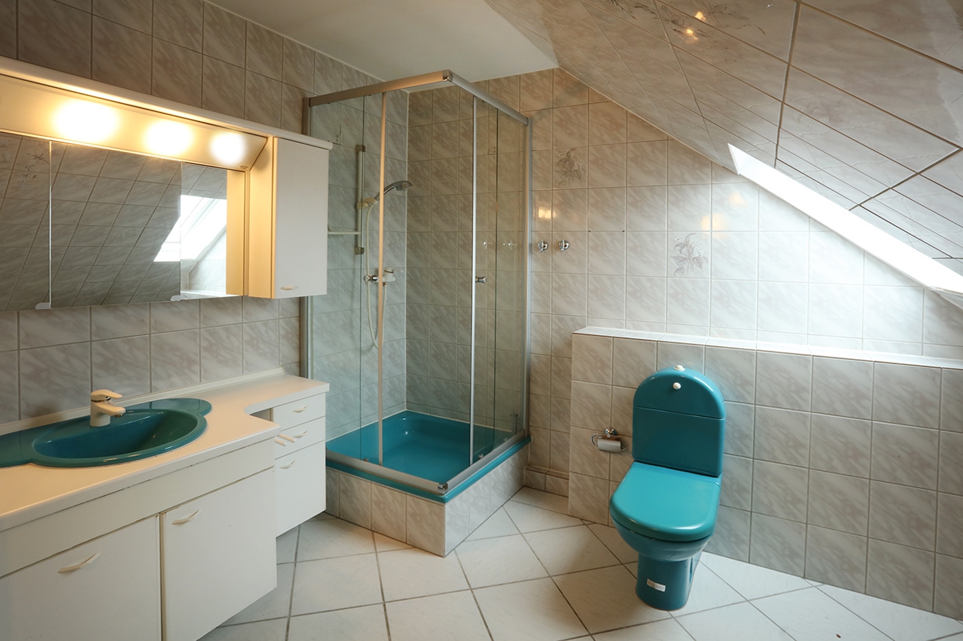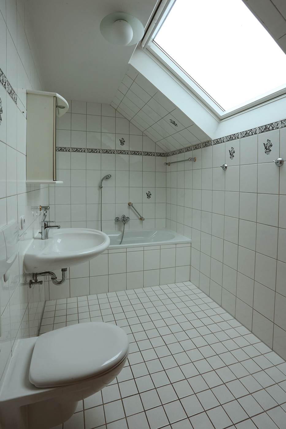 - Badausstattung: Dusche, Badewanne, Fenster im Badezimmer