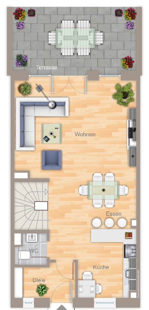 Terrasse im Erdgeschoss mit elektrisch betriebener Markise