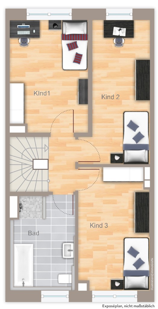 – drei weitere Schlaf-/Kinder-/Arbeitszimmer