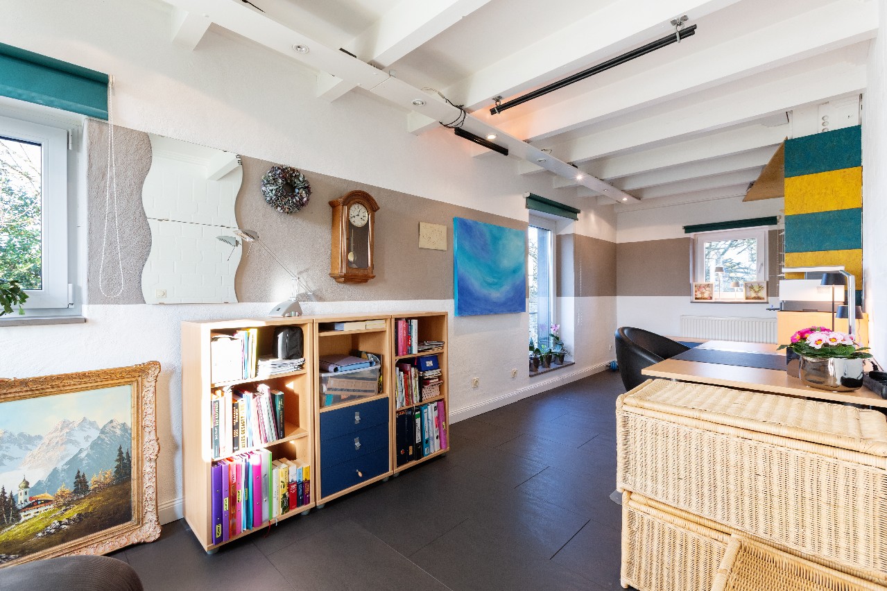 Im Obergeschoss sowie im Dachgeschoss stehen weitere gut geschnittene Räume zur Verfügung, die je nach Bedarf als Schlaf-, Kinder-, Gäste- oder Arbeitszimmer genutzt werden können. Komfortabel ist die Ausstattung mit zwei Bädern, die jeweils sowohl über Dusche als auch Badewanne verfügen praktisch für Familien und zugleich angenehm im Alltag. Ein architektonisches Highlight ist die offen gestaltete Empore oberhalb des Dachgeschosses. Sie eignet sich hervorragend als Homeoffice, Lese- oder Kreativbereich und schafft einen zusätzlichen, offenen Rückzugsort innerhalb des Hauses. Die Empore mit einer Grundfläche von rd. 18 m² ist in der angegebenen Wohnfläche nicht enthalten.