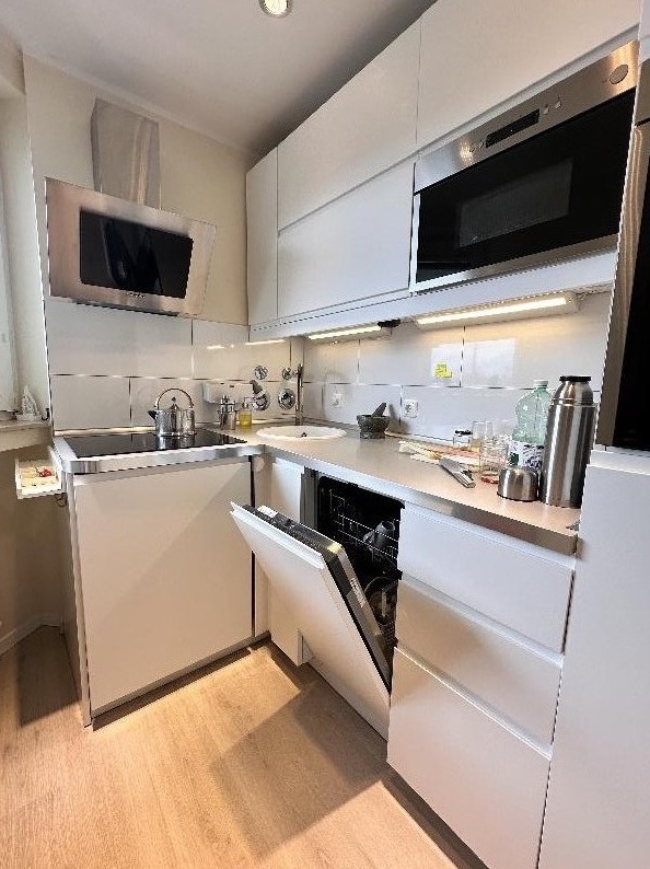 Die separate Küche strahlt in schlichtem Weiß und verfügt über hochwertige Einbaugeräte und Dunstabzug nach außen.