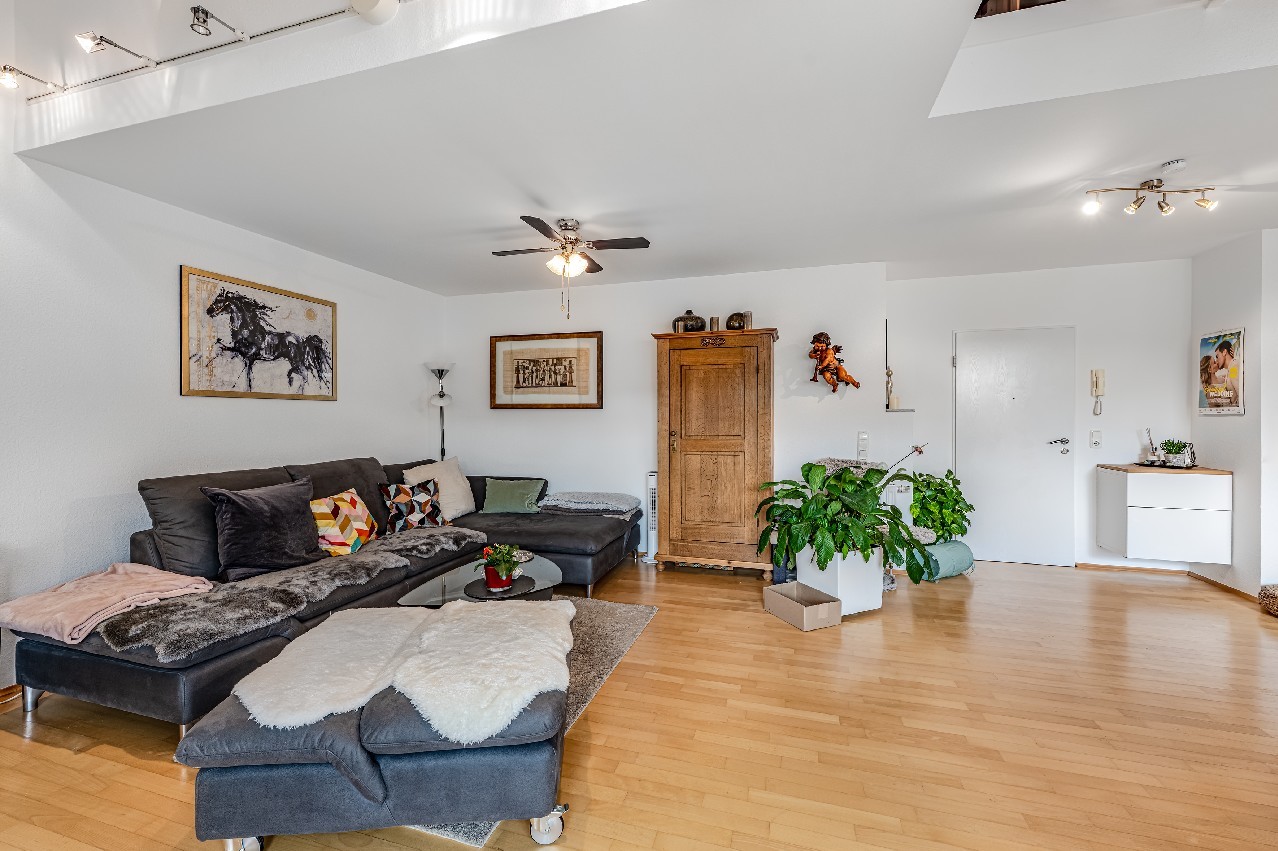 Eine filigrane Wendeltreppe führt ins Galeriegeschoss. Hier beeindruckt besonders der offene Galeriebereich mit Blick in das darunterliegende Geschoss die großzügige Deckenhöhe und der Lichteinfall schaffen ein luftiges, beinahe loftartiges Wohngefühl. Das Galeriegeschoss beherbergt ein geräumiges Elternschlafzimmer mit praktischen Einbauschränken sowie ein Tageslichtbad mit Dusche und Eckbadewanne. Ein weiterer, ursprünglich als Kinder- oder Gästezimmer geplanter Raum wird als private Sauna und Ruhezone genutzt. Ein Rückbau zur Nutzung als Büro oder Kinderzimmer ist auf Wunsch ohne großen Aufwand möglich. Von hier aus gelangen Sie direkt auf den zweiten, uneinsehbaren Balkon mit weitem Blick ins Grüne. Ein Rückzugsort mit echter Wellness-Qualität. Ein kleiner Abstellraum in der Dachschräge komplettiert die Wohneinheit.