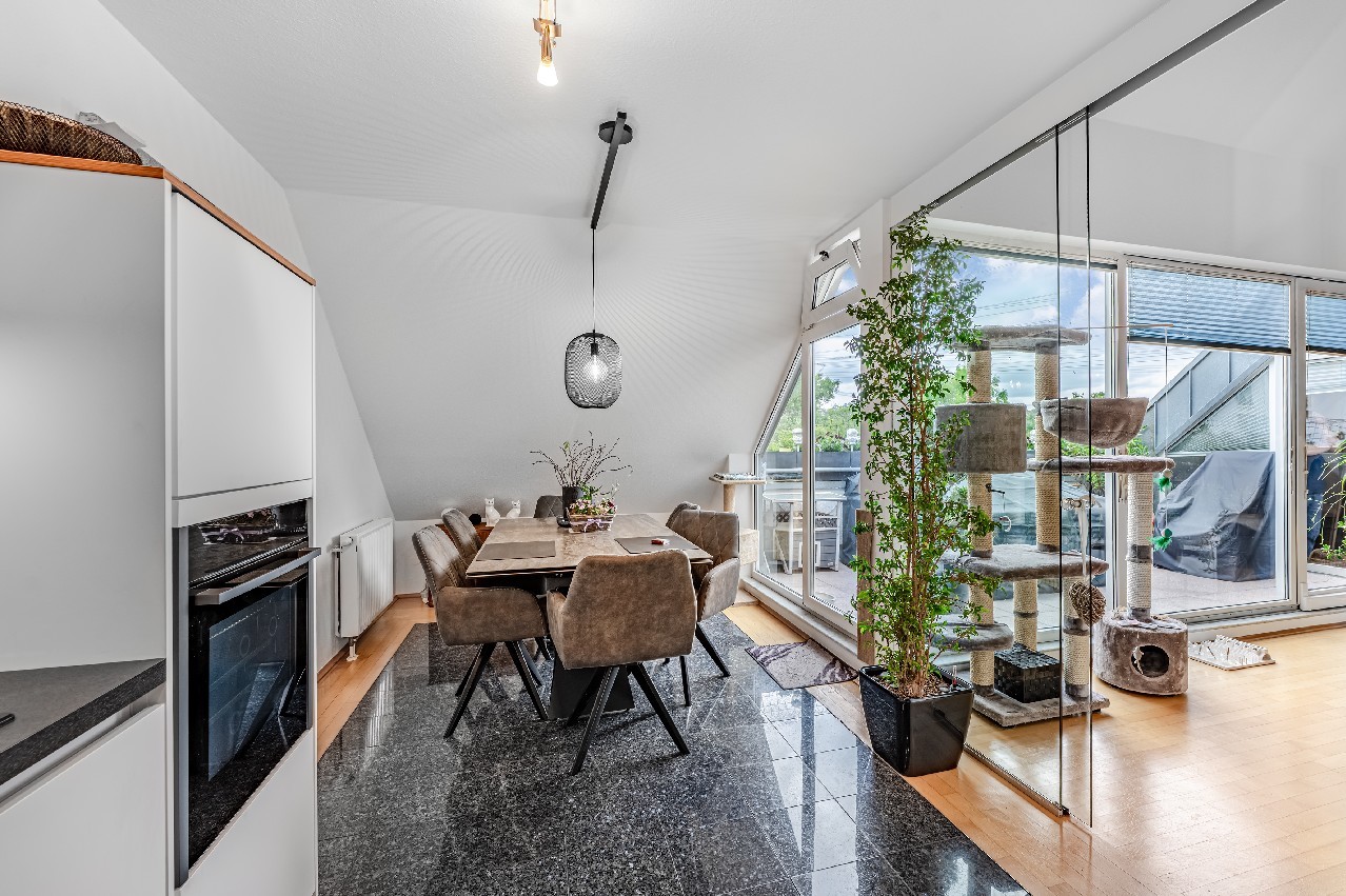 Diese Maisonette-Wohnung erstreckt sich über das 2. Obergeschoss sowie das ausgebaute Galeriegeschoss einer gepflegten Wohnanlage am Rande eines Naturschutzgebiets. Mit einer Wohnfläche von ca. 107 m², zwei Balkonen, einer beeindruckenden Raumhöhe durch die offene Galerie und einer hochwertigen Ausstattung bietet diese Immobilie außergewöhnlichen Wohnkomfort sowohl für Kapitalanleger als auch für Eigennutzer mit Anspruch. Der Zugang zur Wohnung erfolgt über das 2. Obergeschoss. Hier eröffnet sich ein großzügiger Wohnbereich mit Zugang zum großen Balkon in Westausrichtung. Über ein großes Schiebetürelement gelangen Sie ins Freie. Die Küche und der Essplatz sind durch eine elegante Glasschiebetür vom Wohnraum separiert. Die moderne Einbauküche wurde erst im vergangenen Jahr von
