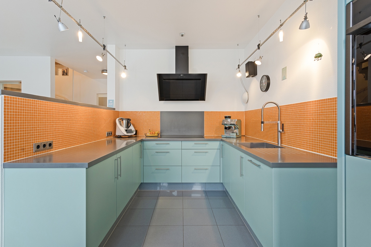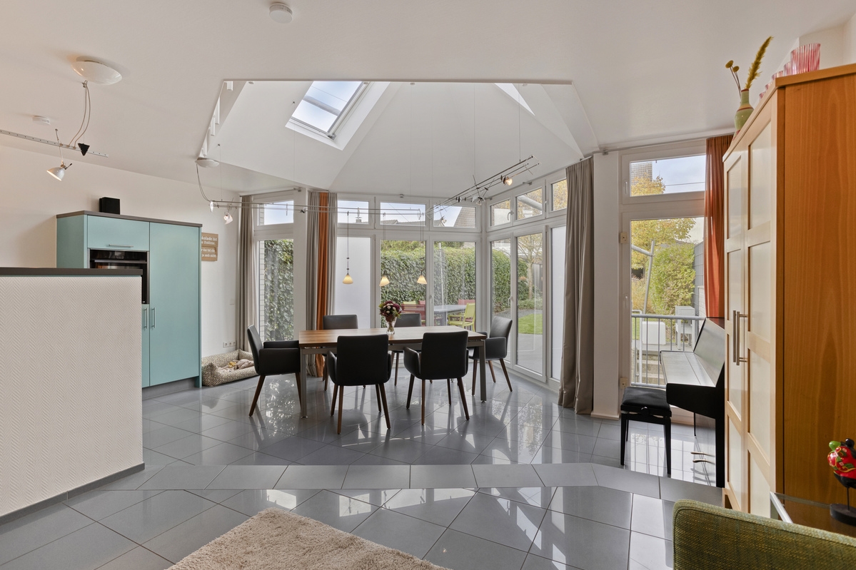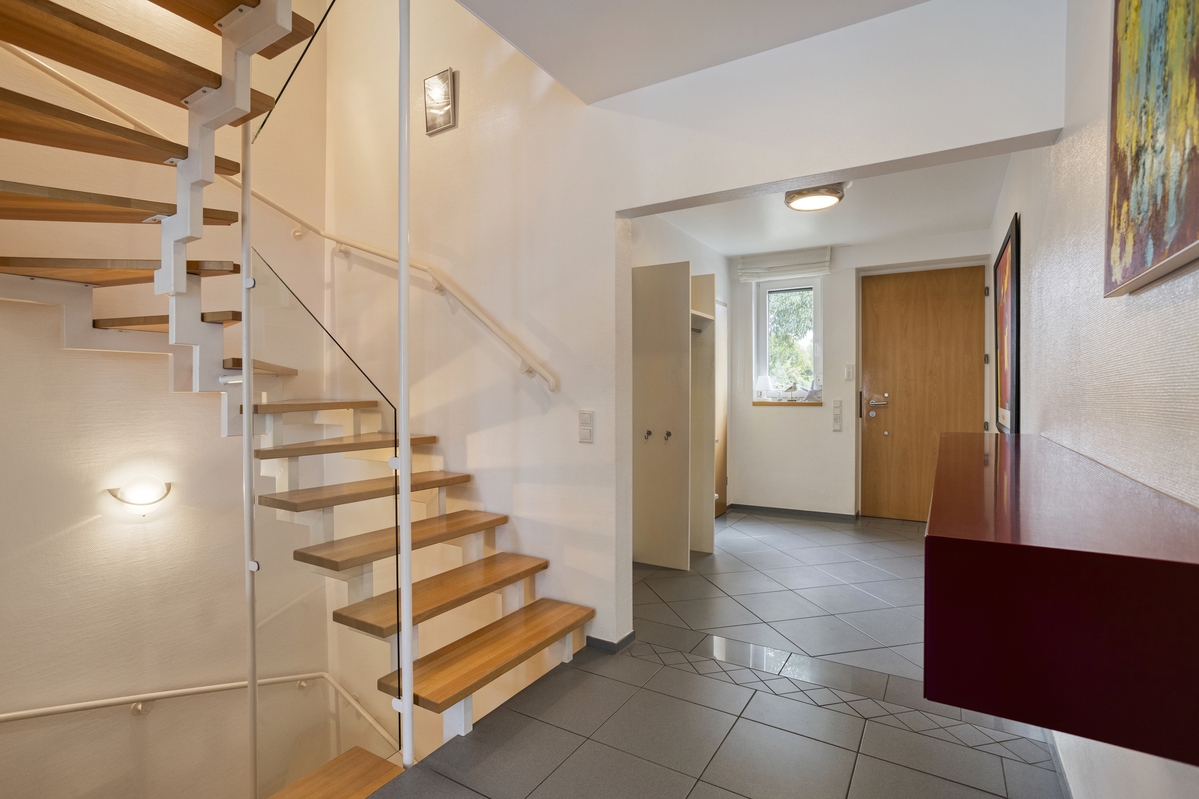 Im Erdgeschoss gelangen Sie zunächst in einen Flur, der ausreichend Platz für eine kleine Garderobe bietet. Zur rechten Seite befinden sich das Gäste-WC sowie ein praktischer Abstellraum. Im hinteren Bereich öffnet sich der großzügige Wohn- und Essbereich mit offener Küche. Oberlichter und eine große Fensterfront sorgen für viel Tageslicht und schaffen eine angenehme Wohnatmosphäre. Von hier aus besteht direkter Zugang zur einladenden Terrasse, ideal für einen gemütlichen Outdoor-Essbereich mit schönem Blick in den grünen Garten.