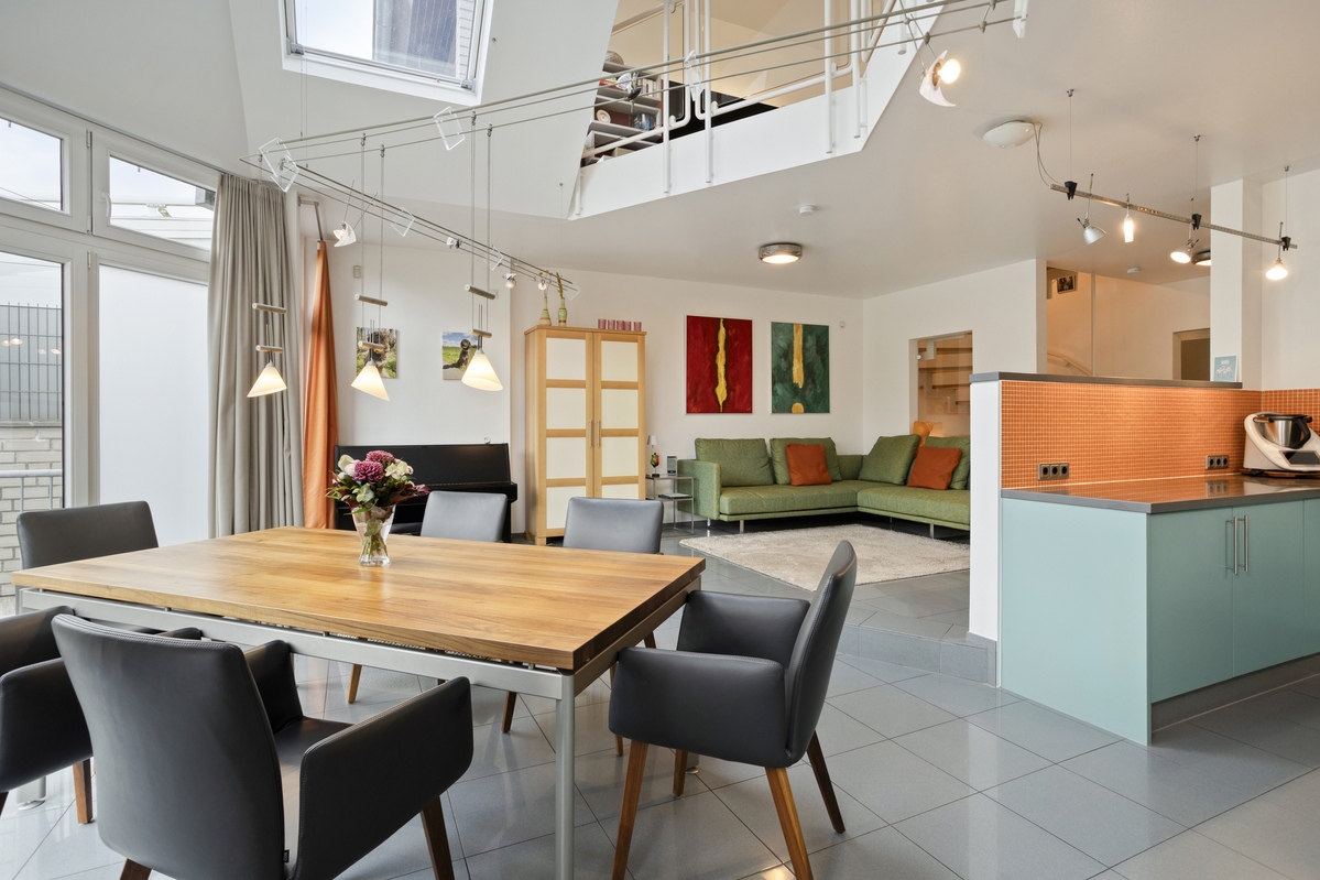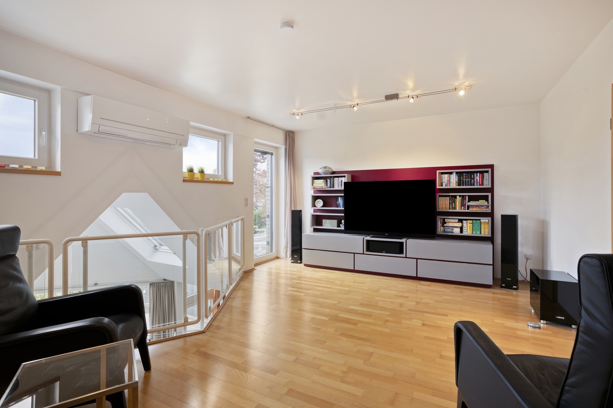 Im Obergeschoss erwartet Sie ein großzügiger Wohnbereich, der durch eine architektonisch gelungene Gestaltung wie eine Galerie wirkt. Der Luftraum zwischen Erd- und Obergeschoss ermöglicht den Blick auf den Essbereich im Erdgeschoss und verleiht dem Haus ein offenes Raumgefühl. Auf dieser Etage befinden sich zudem ein Tageslichtbad mit Dusche und Badewanne sowie ein gemütliches Schlafzimmer. Zwischen Bad und Schlafzimmer ist ein Einbauschrank integriert, der von beiden Räumen aus genutzt werden kann ein durchdachtes Detail, das zusätzlichen Stauraum bietet.