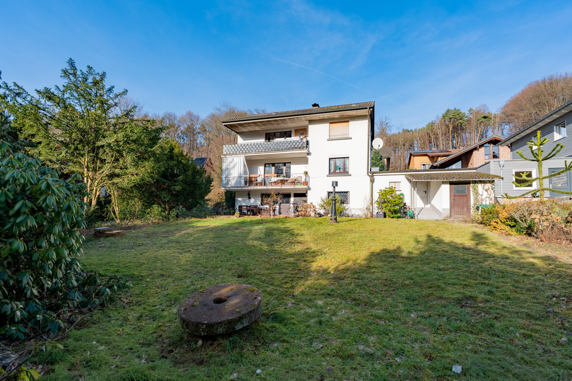 Ein weiteres Highlight ist das Gartengeschoss in Hanglage, welches neben klassischen Abstell- und Nutzräumen auch einen Waschkeller sowie wohnlich ausgebaute großzügige Gesellschaftsräume mit eigener Küche und Kamin umfasst. Von dort besteht direkter Zugang zur Terrasse und in den Garten, wodurch sich dieser Bereich hervorragend für gesellige Abende, Feiern oder als Hobby- und Freizeitbereich eignet. Die Immobilie befindet sich in renovierungsbedürftigen Zustand, der Käufern die Möglichkeit bietet, durch gestalterische und technische Maßnahmen ihre eigenen Wohnvorstellungen zu verwirklichen und das Haus individuell zu modernisieren. Die solide Bausubstanz, der attraktive Grundriss und die naturnahe Lage machen dieses Objekt zu einer Immobilie mit besonderem Potenzial.