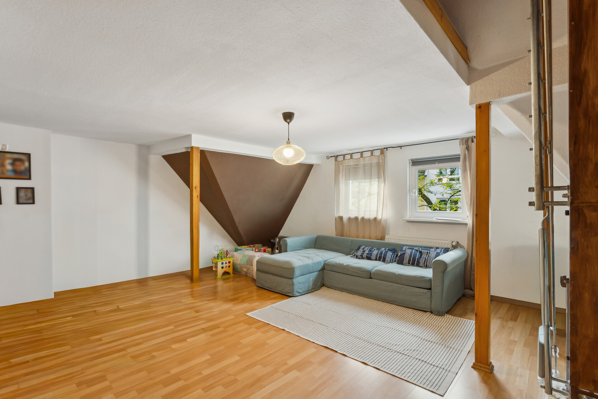 Im Dachgeschoss befindet sich eine bereits teilgenehmigte Wohnung. Der Ausbau überzeugt durch ein großzügig geschnittenes Wohnzimmer sowie ein Schlafzimmer. Darüber hinaus besteht Zugang zum bereits ausgebauten Spitzboden, der sich ideal als Hobbyraum oder zusätzlicher Stauraum nutzen lässt. Das geräumige Badezimmer ist mit Dusche und Badewanne ausgestattet. Eine separate Küche komplettiert das Raumangebot dieser besonderen Wohneinheit.