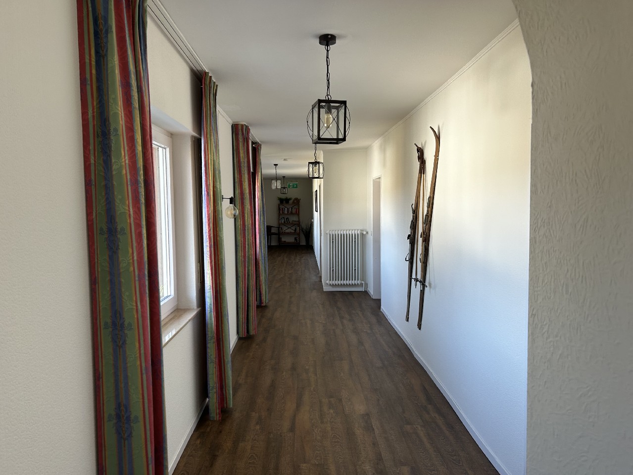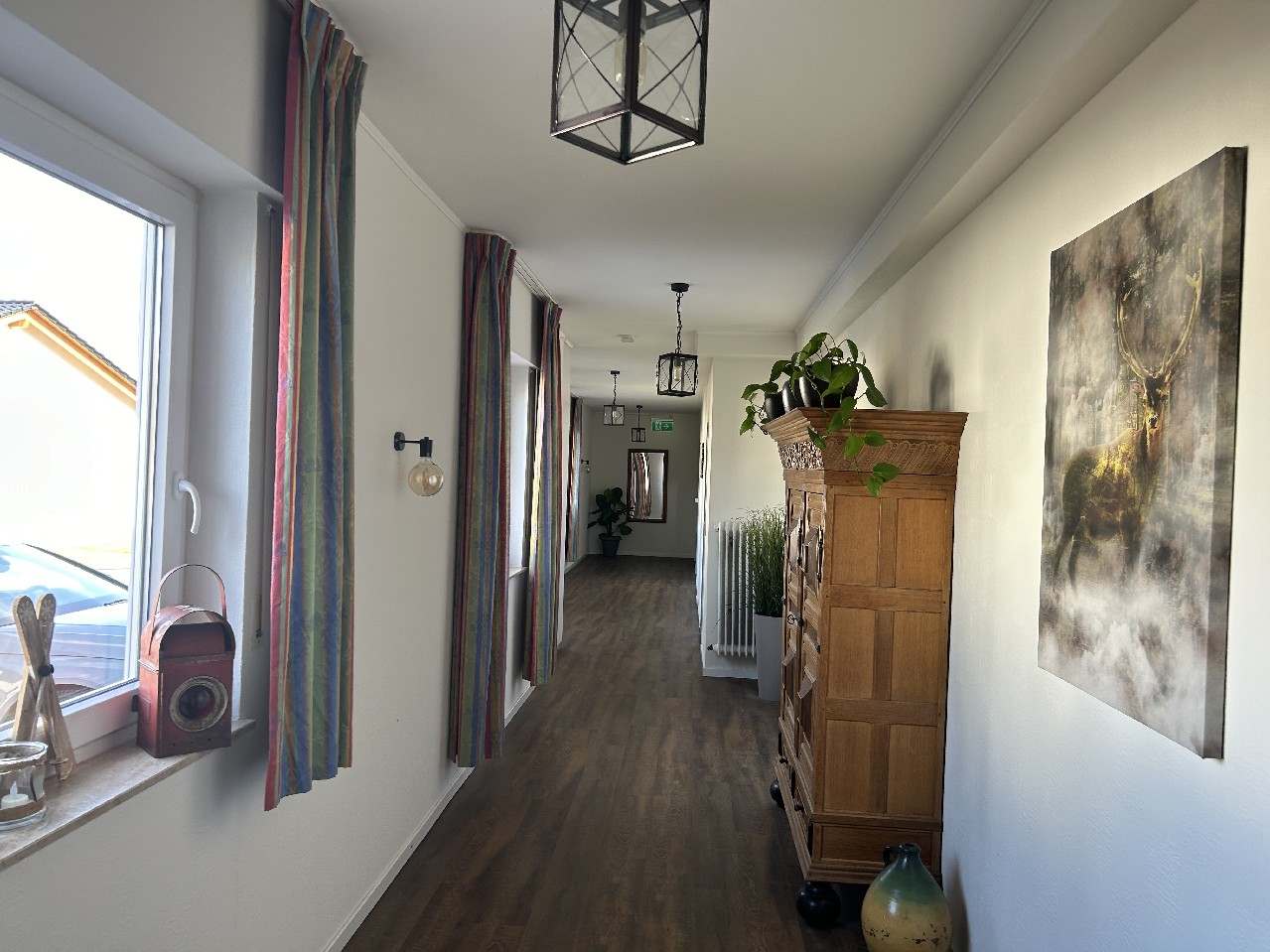 7 gemütliche und vollständig eingerichtete Doppelzimmer. Ein Einzelzimmer. Gastraum und Betreiberküche. Hauswirtschaftsraum. Küchenvorrat mit Kühlzellen. Betreiberwohnung mit 4 Zimmern, Kochen, Diele, 2 x Bad/WC und Abstellraum. Terrasse und Loggia. Garagen.