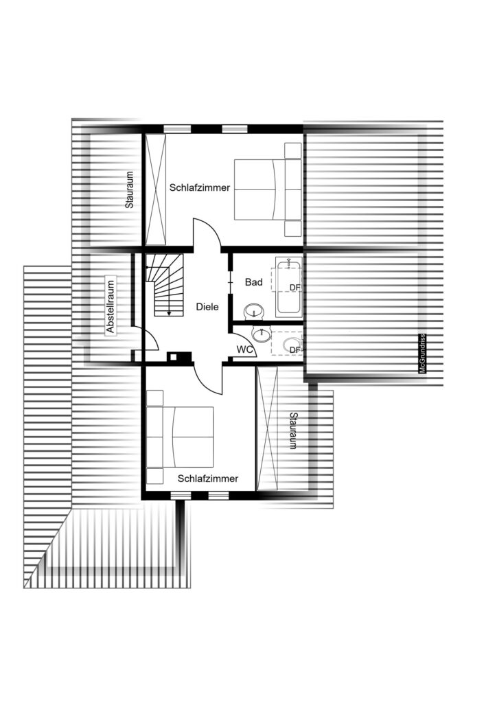 Im Obergeschoss gelangt man über einen Flur zu den weiteren Räumen des Hauses. Dazu zählen: zwei Schlafzimmer, ein Bad mit Badewanne und separiertem WC, jeweils mit Tageslichtfenster. Auch hier kann man von beiden Schlafbereichen den Blick auf die großen grünen Außenanlagen und den Waldbereich genießen.