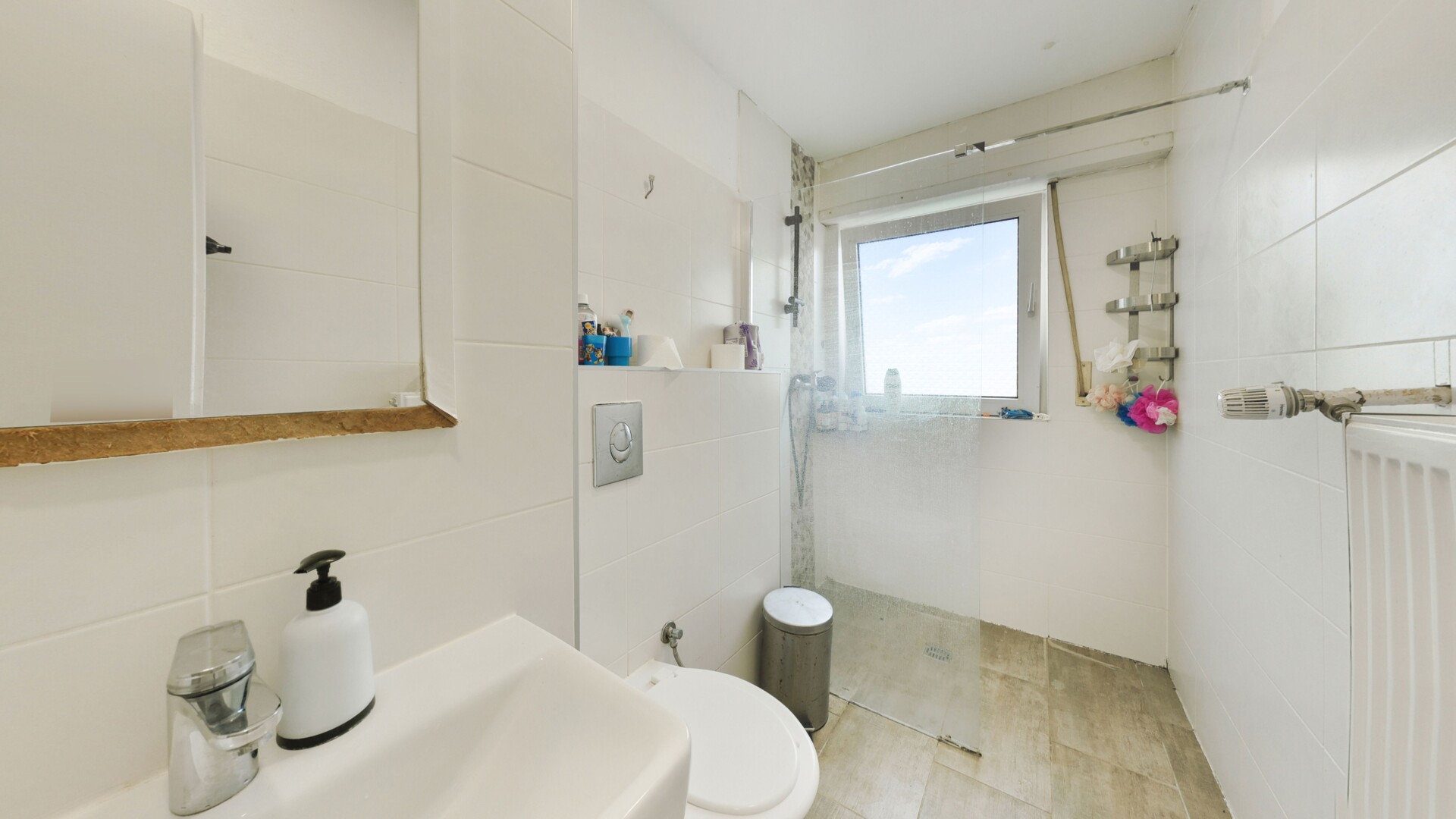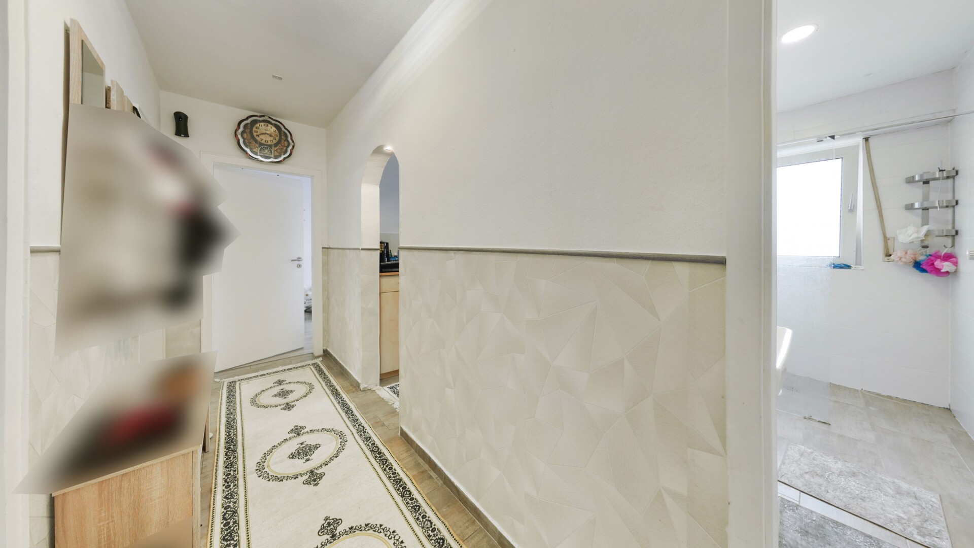 Die separate Küche bietet Raum für moderne Einbauten und ist funktional gestaltet. Das tagesbelichtete Badezimmer überzeugt durch ein Fenster und eine moderne Dusche, was für eine angenehme Belüftung und viel natürliches Licht sorgt. Ein Flur mit praktischen Stellflächen verbindet alle Räume harmonisch miteinander.