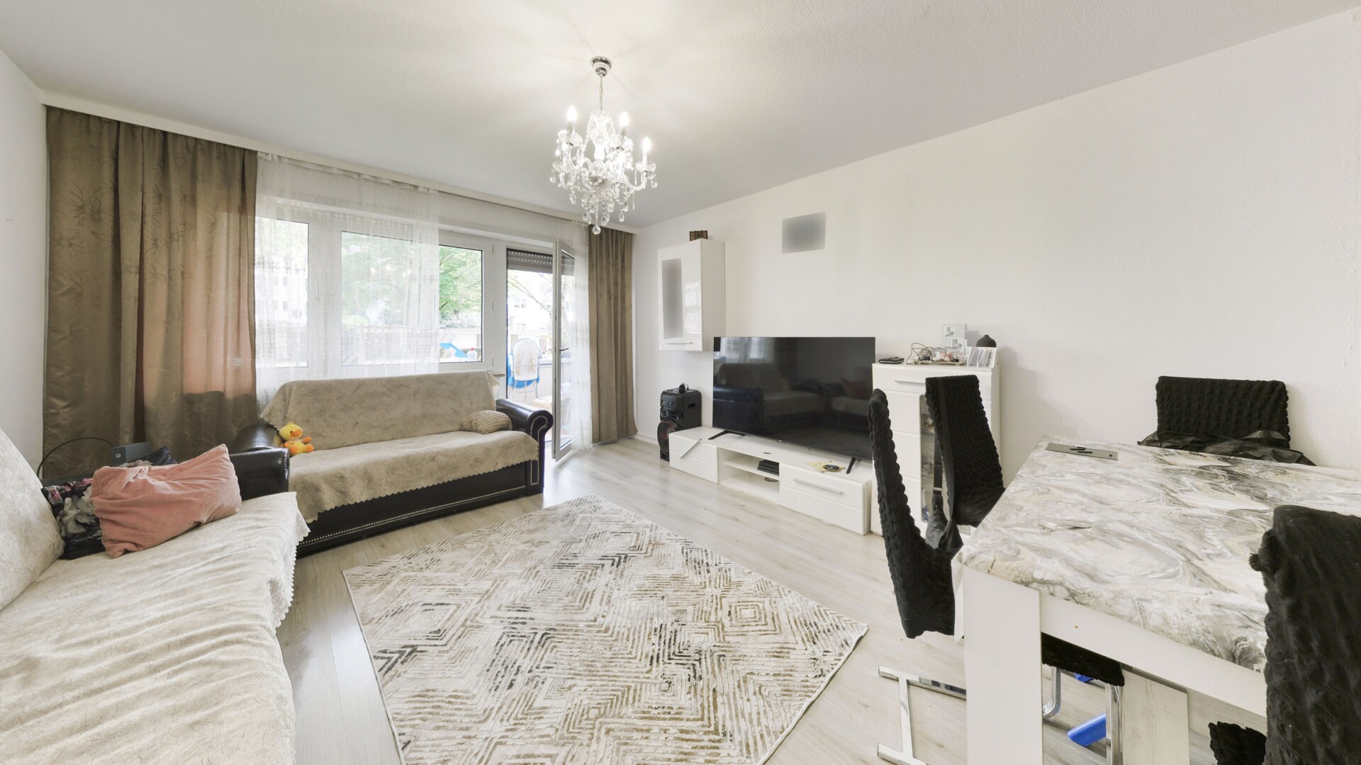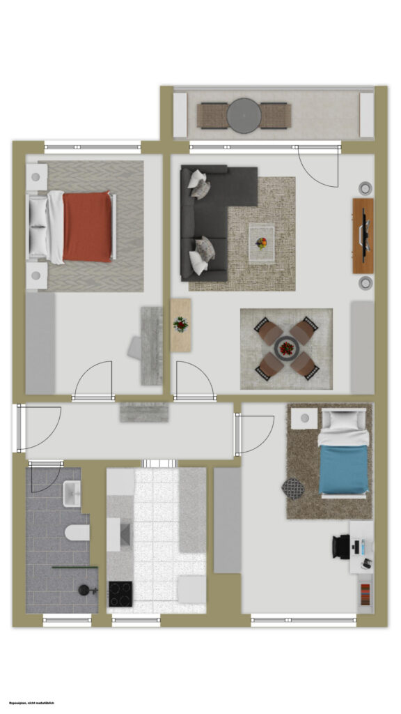 Herzstück der Wohnung ist das großzügige, lichtverwöhnte Wohnzimmer, das ausreichend Platz für eine gemütliche Sofalandschaft sowie einen separaten Essbereich bietet. Von hier aus haben Sie direkten Zugang zum sonnigen Südbalkon – ein idealer Rückzugsort, um entspannte Stunden im Freien zu genießen. Die intelligente Raumaufteilung umfasst zudem zwei gut geschnittene Schlafzimmer: Das Hauptschlafzimmer bietet viel Raum für ein großes Doppelbett und Schrankflächen, während das zweite Zimmer flexibel als Kinderzimmer, Home-Office oder Gästezimmer genutzt werden kann.