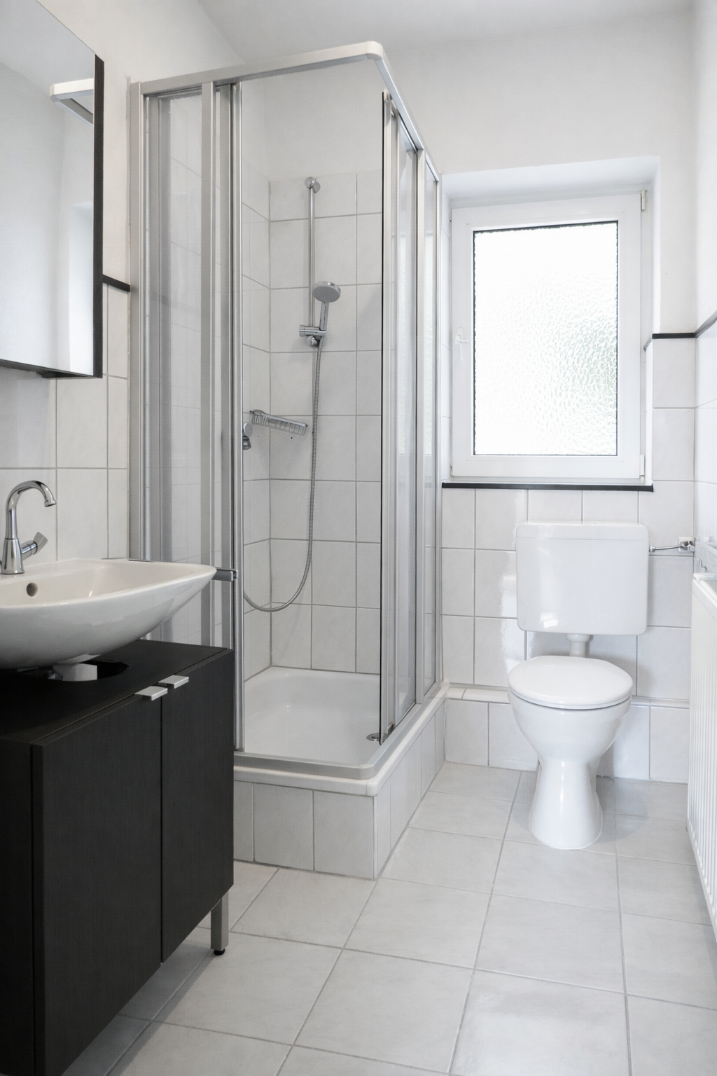 Badezimmer: Tageslichtbad mit Dusche sowie Spiegelschrank und Waschtisch